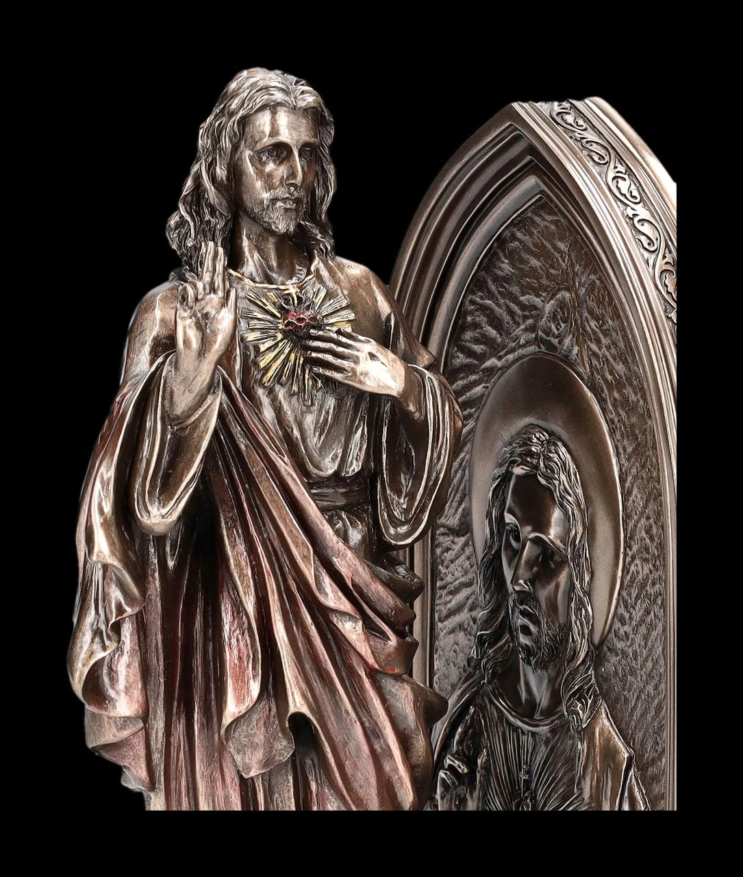 Ob die Bibel oder auch andere Bücher mit am Herzen liegenden Themen im Regal stehen – diese Buchstütze mit der Jesus Figur ‚Heiligstes Herz Jesu‘ wird die Bücher nicht nur stützen, sondern perfekt ergänzen. Auch wenn heute die Zeit um Fronleichnam in der römisch-katholischen Spiritualität der Verehrung des ‚Heiligsten Herzen Jesus‘ gewidmet ist, so gehörte es bereits im Mittelalter zu den wichtigsten Symbolen der Christus Frömmigkeit und wurde als Symbol seines Menschseins gedeutet. Die 22 cm hohe, 12,5 cm breite und 14 cm tiefe Buchstütze mit der Jesus Figur aus der Studio Collection von Veronese wurde aus hochwertigem Kunststein (Polyresin) gefertigt. Sie wurde sorgfältig bronziert und zurückhaltend coloriert und wirkt dadurch sehr edel. Vielleicht gleich mit dem passenden Gegenstück, der Buchstütze mit der Marien-Figur ‚Unbeflecktes Herz Maria‘, ist diese Jesus-Figur als Buchstütze auch ein wunderbares Geschenk.